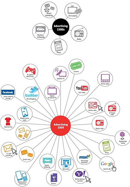 On a donc un essor considérable de la publicité, comme le montre le schéma ci-dessous qui met en parallèle la publicité présente en 1980, et celle en 2009 :